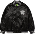Made of 100% polyester satin, this jacket features printed artwork at the left chest and back, a snap-button front, front welt pockets, and yarn-dyed stripe rib-knit detailing at the collar, cuffs, and hem. It also includes a HUF woven label at the interior neck.